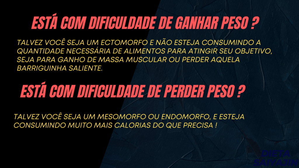 E se você resolve fazer uma dieta, você precisa saber qual é o seu biotipo para não consumir calorias a mais. e existe 3 biotipos, que são: Ectomorfo, mesomorfo e endomorfo.